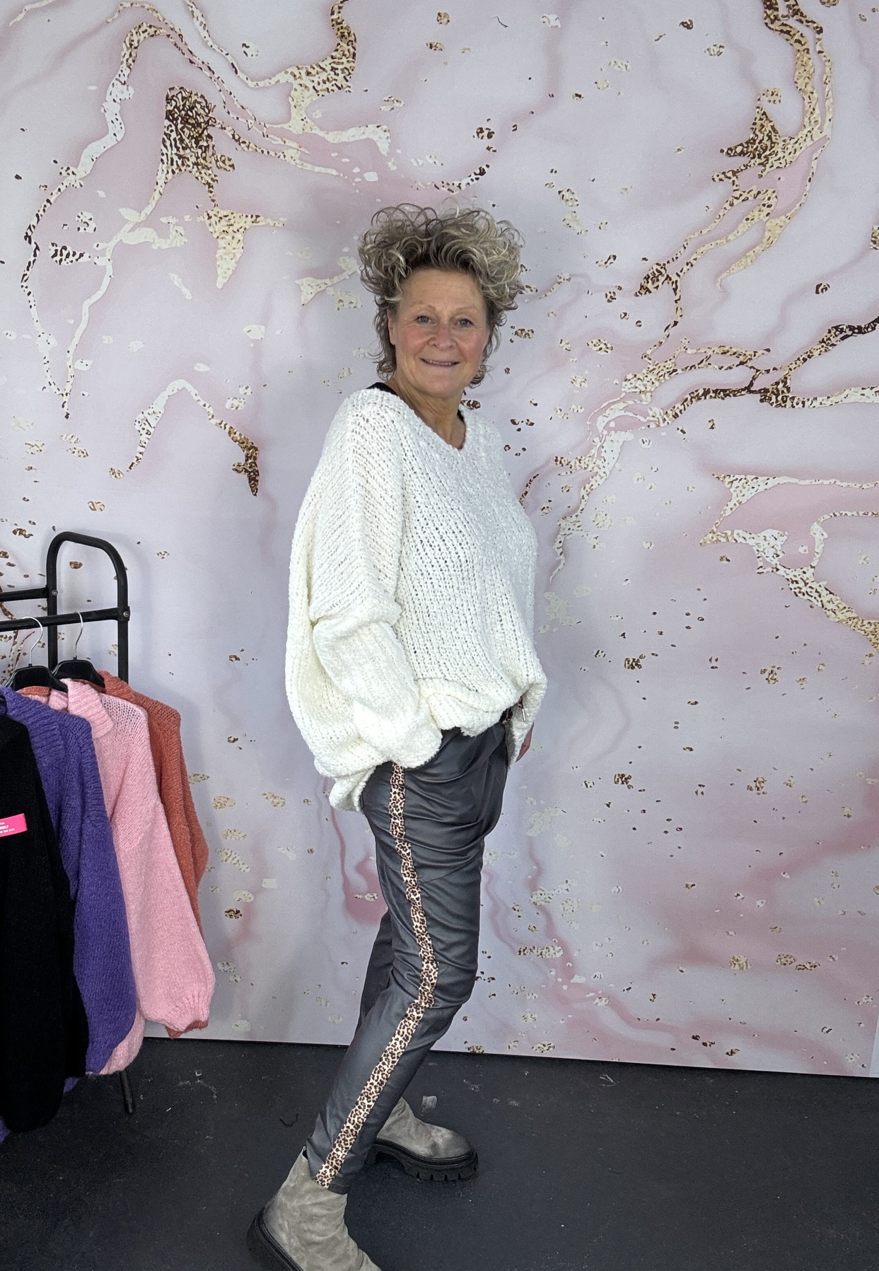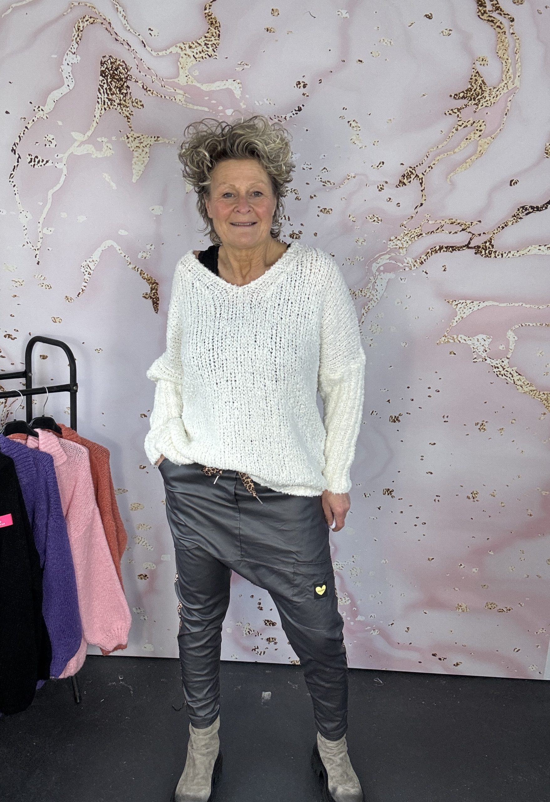 – Miriam draagt zoals normaal gesproken een maat M en is 1,75 m.