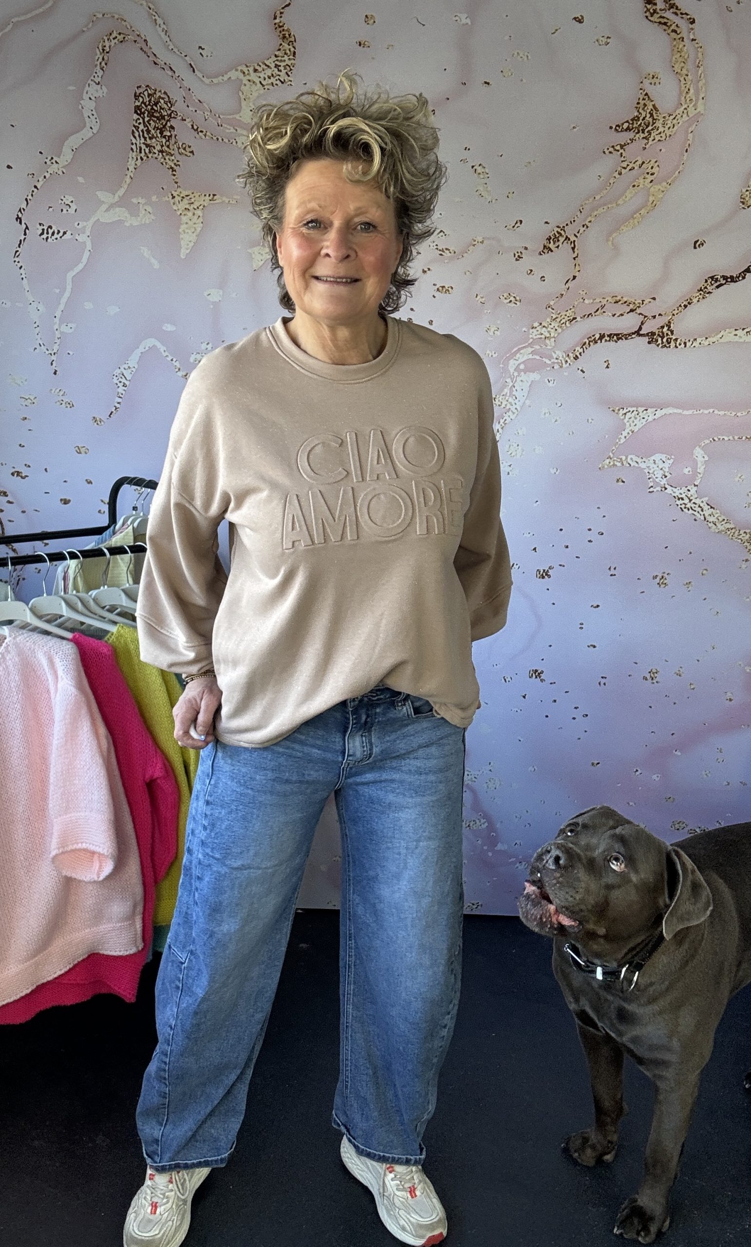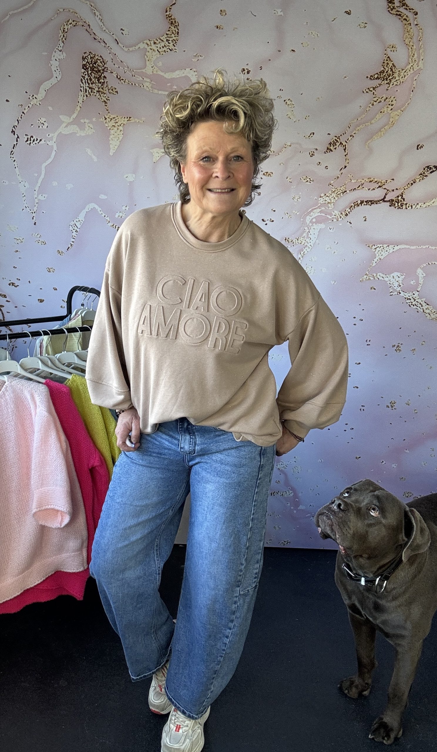 De sweater is leuk ruimvallend en die mooie zachte sweat stof, leuk met zakken en een licht glimmertje in de stof