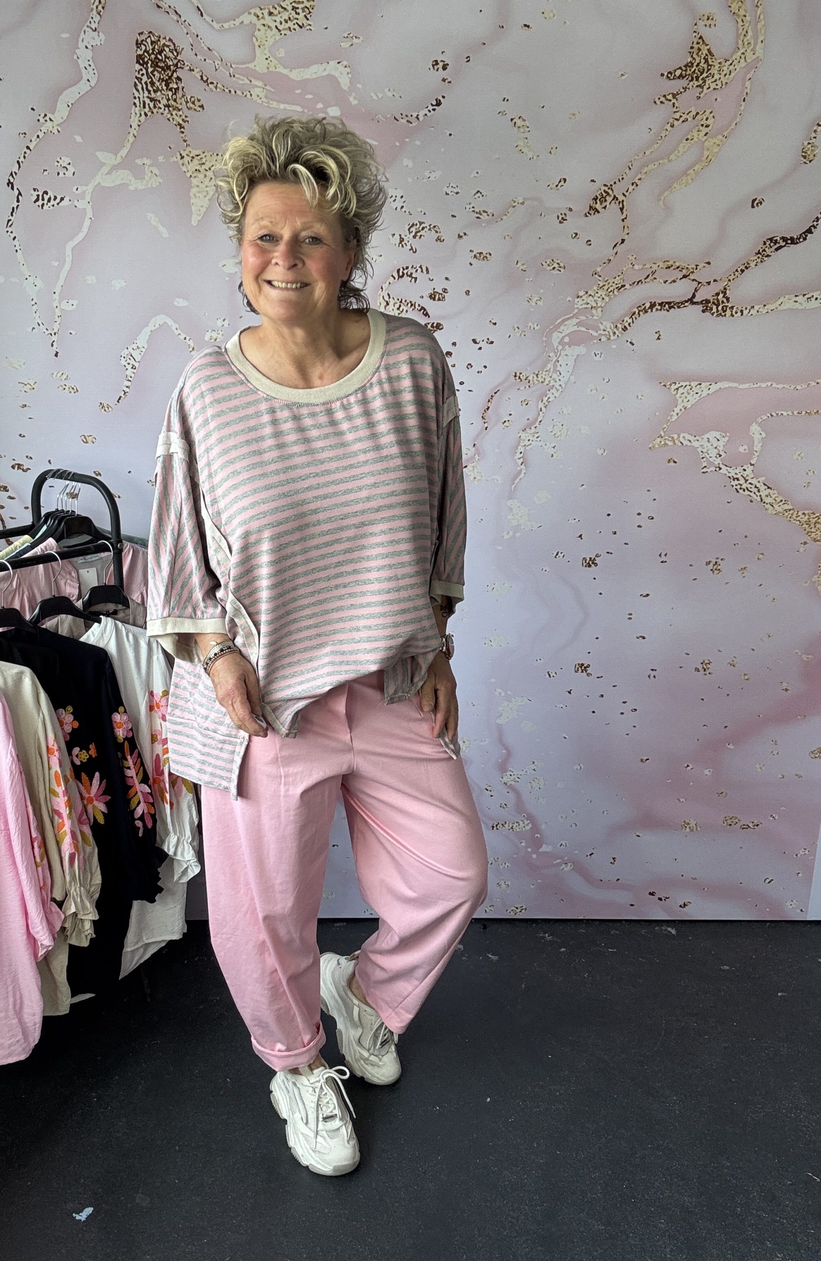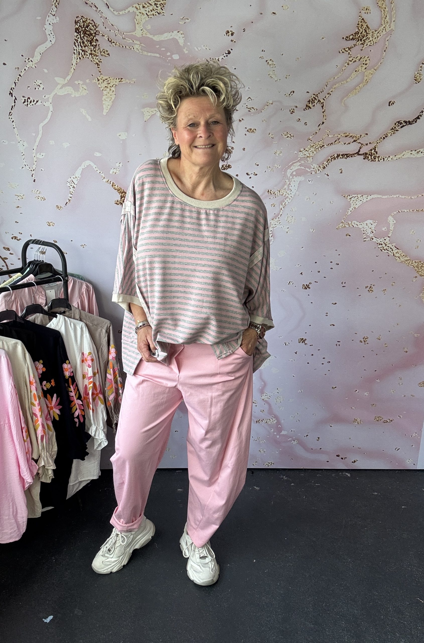 – Miriam draagt zoals normaal gesproken een maat M en is 1,75 m.