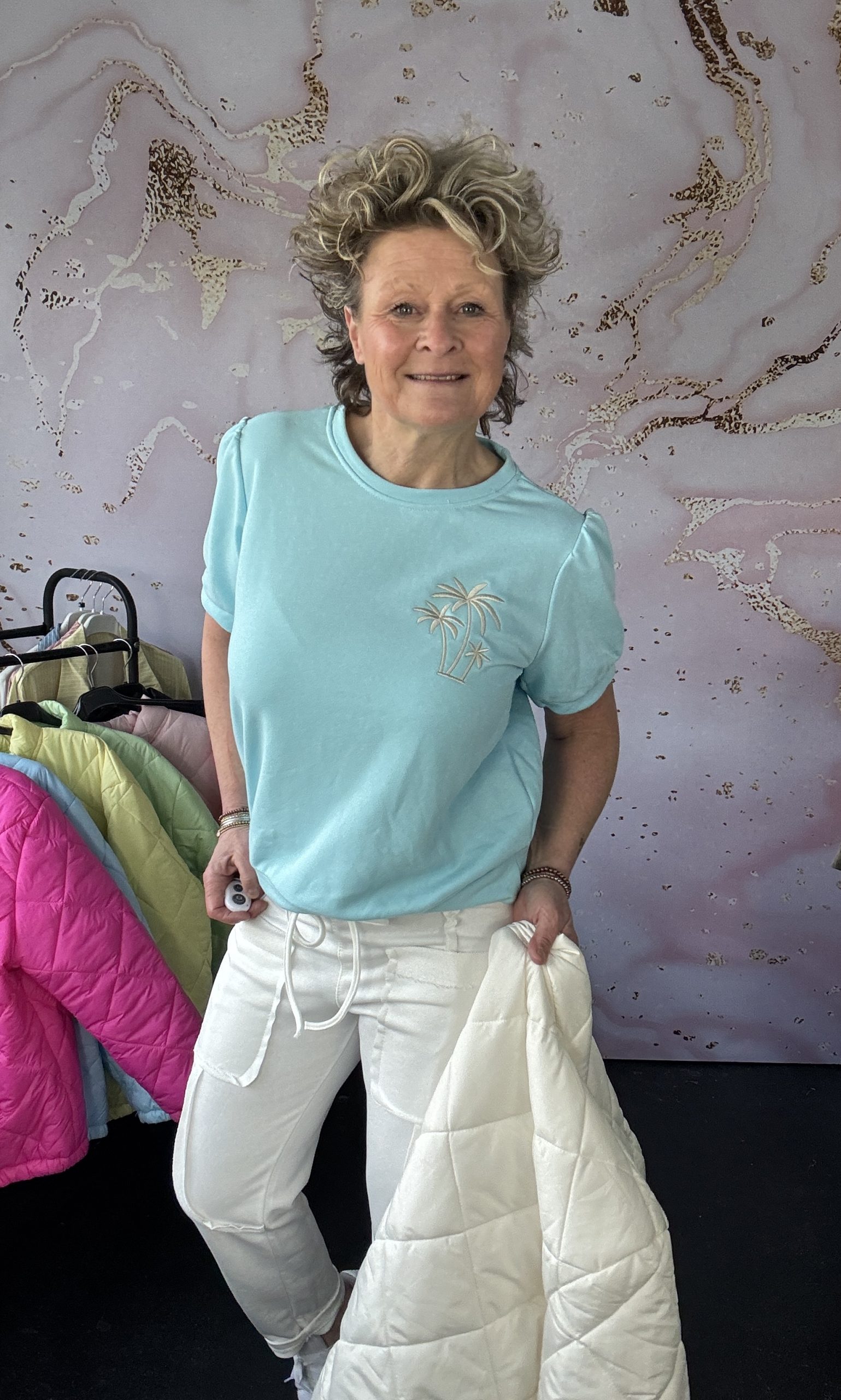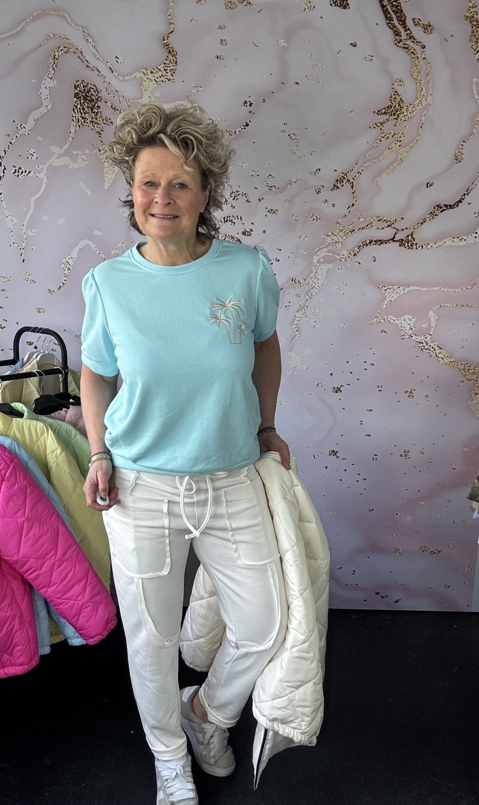 De sweater is leuk door de plooi op de schouder en de korte mouw