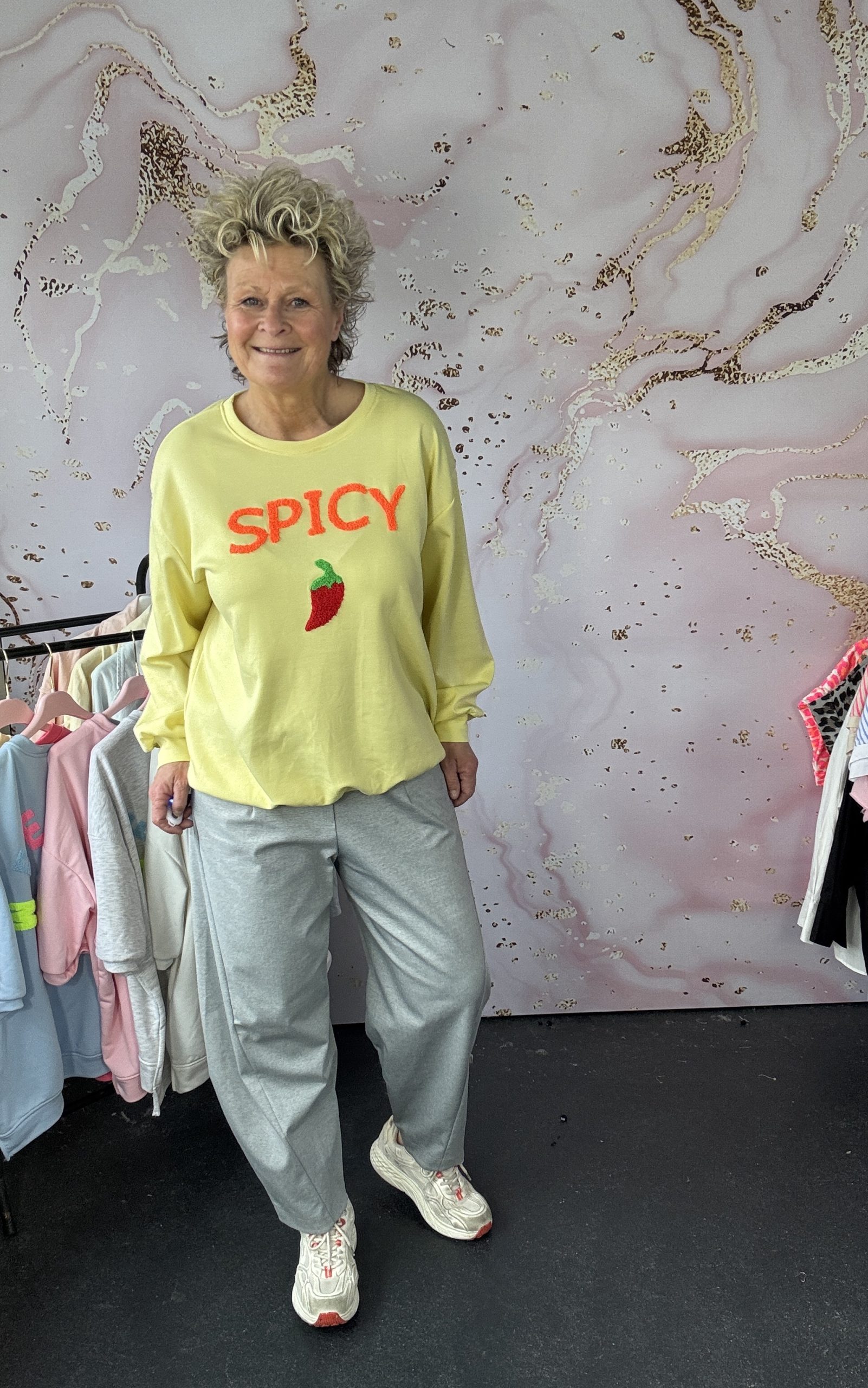 – Miriam draagt zoals normaal gesproken een maat M en is 1,75 m.