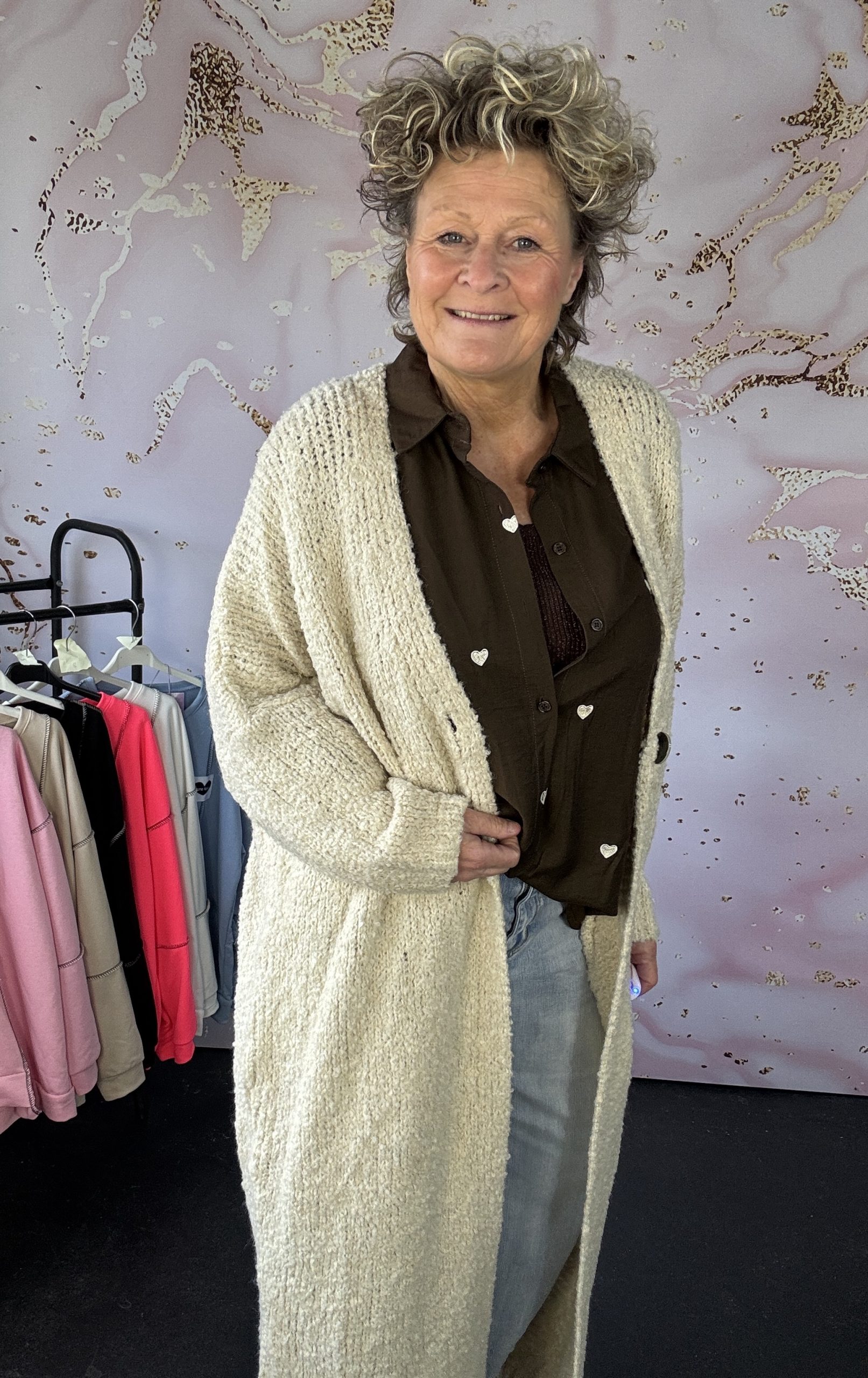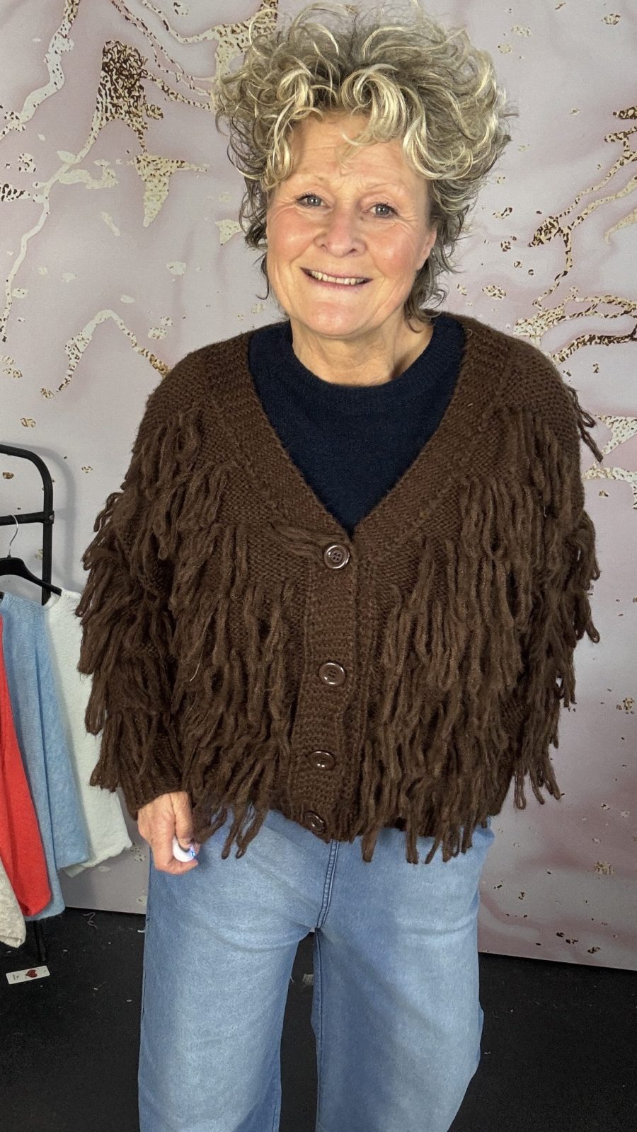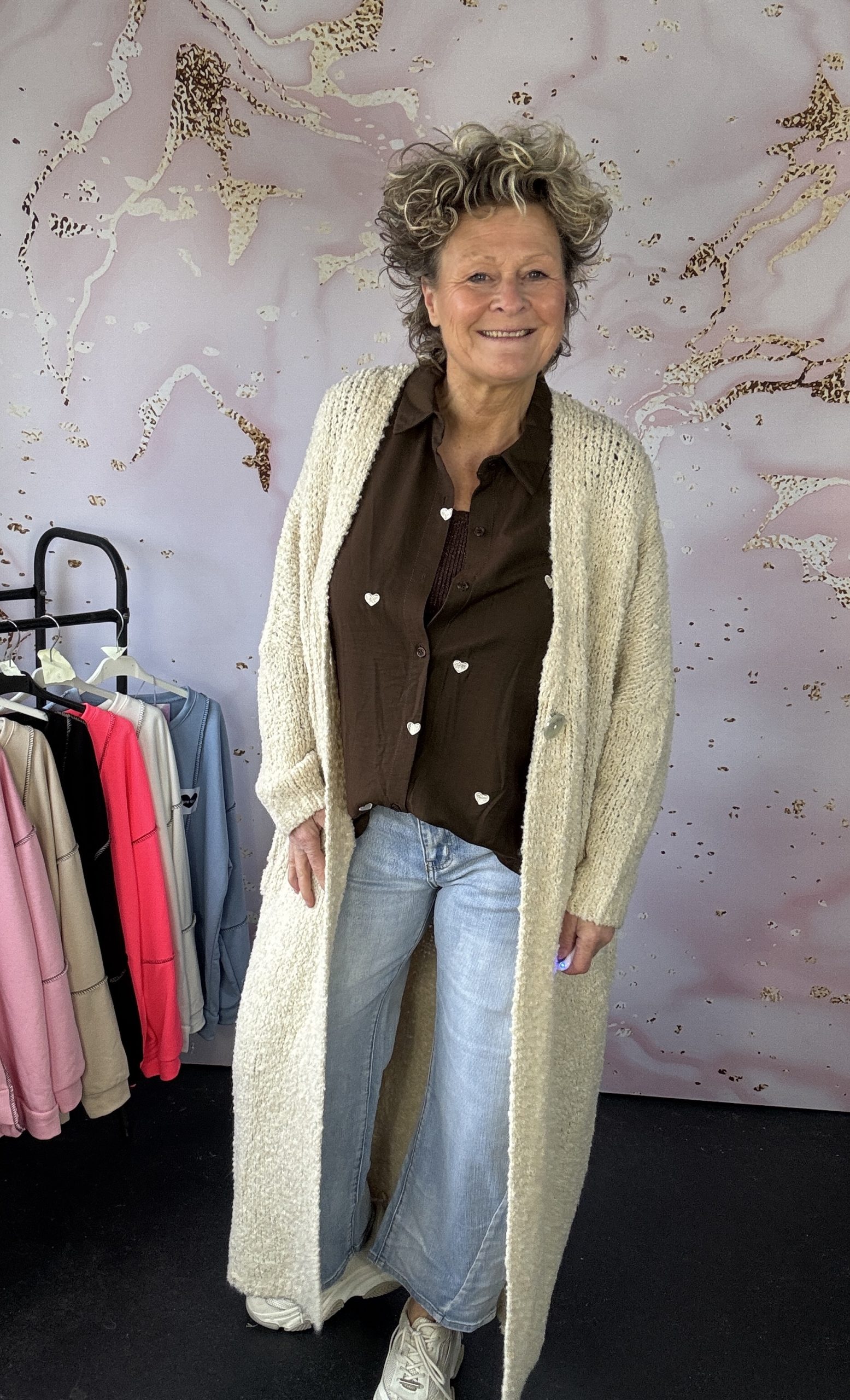 het geweldig lange vest is van prachtige kwaliteit en boucle maakt t heel comfortabel, sluit dmv knoop
